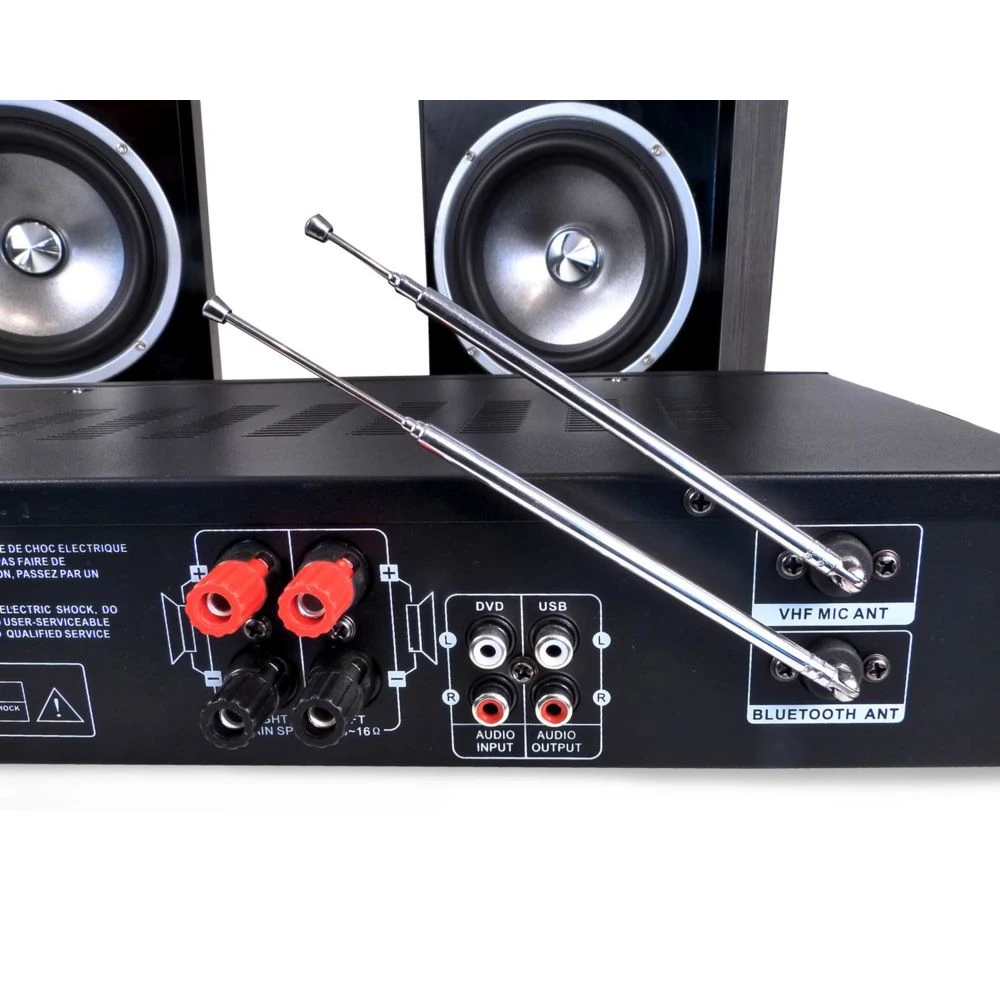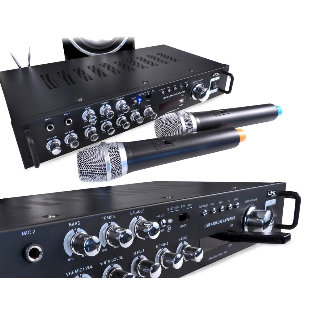 Ensemble KARAOKE avec afficheur digital, SystĂšme Bluetooth pour envoyer le son de votre smartphone ou tablette et de 2 micros HF.Ce systĂšme est prĂȘt-Ă -brancher avec ses fonctions intĂ©ressantes, parfait pour passer de bons moments entre amis lors de vos soirĂ©es.CARACTĂRISTIQUES TECHNIQUES :AMPLICATEUR :Connectiques ampli : 1 x USB, 4 x entrĂ©es microphone jack 6,3 mm, 1 x entrĂ©e stĂ©rĂ©o ligne RCA, 2 x jeu de bornes d’enceintesFonction BluetoothRĂ©glages : Micros, Echo, basses, aigues, balance, master et USBEcran DIGITAL qui indique le titre, le mode et le compteurPuissance RMS : 2 X 20 WPuissance maxi : 2 x 40 WAlimentation : 220-240V AC 50/60 HzDimensions : 43 x 28 x 8 cm ENCEINTES :Haut parleurs : 2 boomers 6.5/16,5 cm & 1 Tweeter 1/2,5 cmFaçades laquĂ©es noiresPuissance RMS : 2 x 20 WPuissance max : 200 WImpĂ©dance : 6 OhmsSensibilitĂ© : 88 dB (+-3dB)Bande Passante : 20-20.000HzDimensions : 57 x 20 x 26,5 cmFrĂ©quences des micros VHF : 215,5 MHz , 190.6 MHz2 MICROS :Type : dynamique unidirectionnelSensibilitĂ© : 76 dB +/- 3 dBBande passante : 80-12 500 HzInterrupteur marche/arrĂȘtPoids total : 25 KG