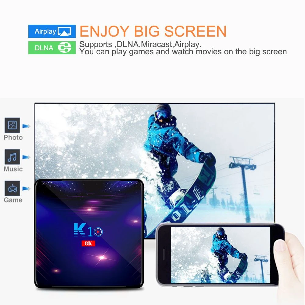 Le K10 Smart Android TV Box peut transformer votre téléviseur traditionnel et votre moniteur LCD en un centre multimédia en connectant Internet (via WiFi ou RJ45). Cette Smart TV Box Android vous apportera beaucoup de plaisir et de commodité avec sa puissante fonctionnalité: Android 9.0, processeur Amlogic S905X3 Quad-Core 64 bits Cortex-A55, GPU Mali-G31 MP2, 4 Go DDR3 + 32 Go eMMC / 4 Go DDR3 + 64 Go eMMC / 4 Go DDR3 + 128 Go eMMC en option, décodage vidéo 8K, WiFi double bande 2,4 G / 5 G, connexion LAN BT4.1 et 1000M.