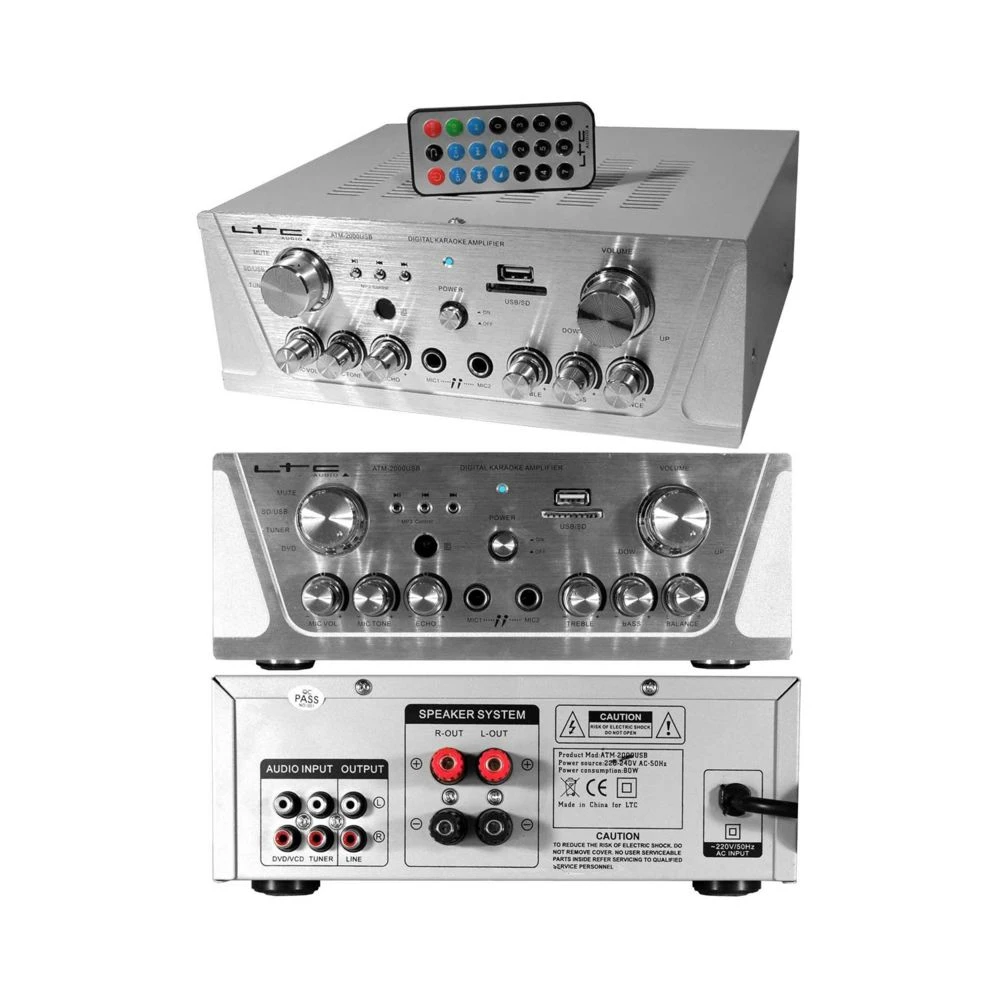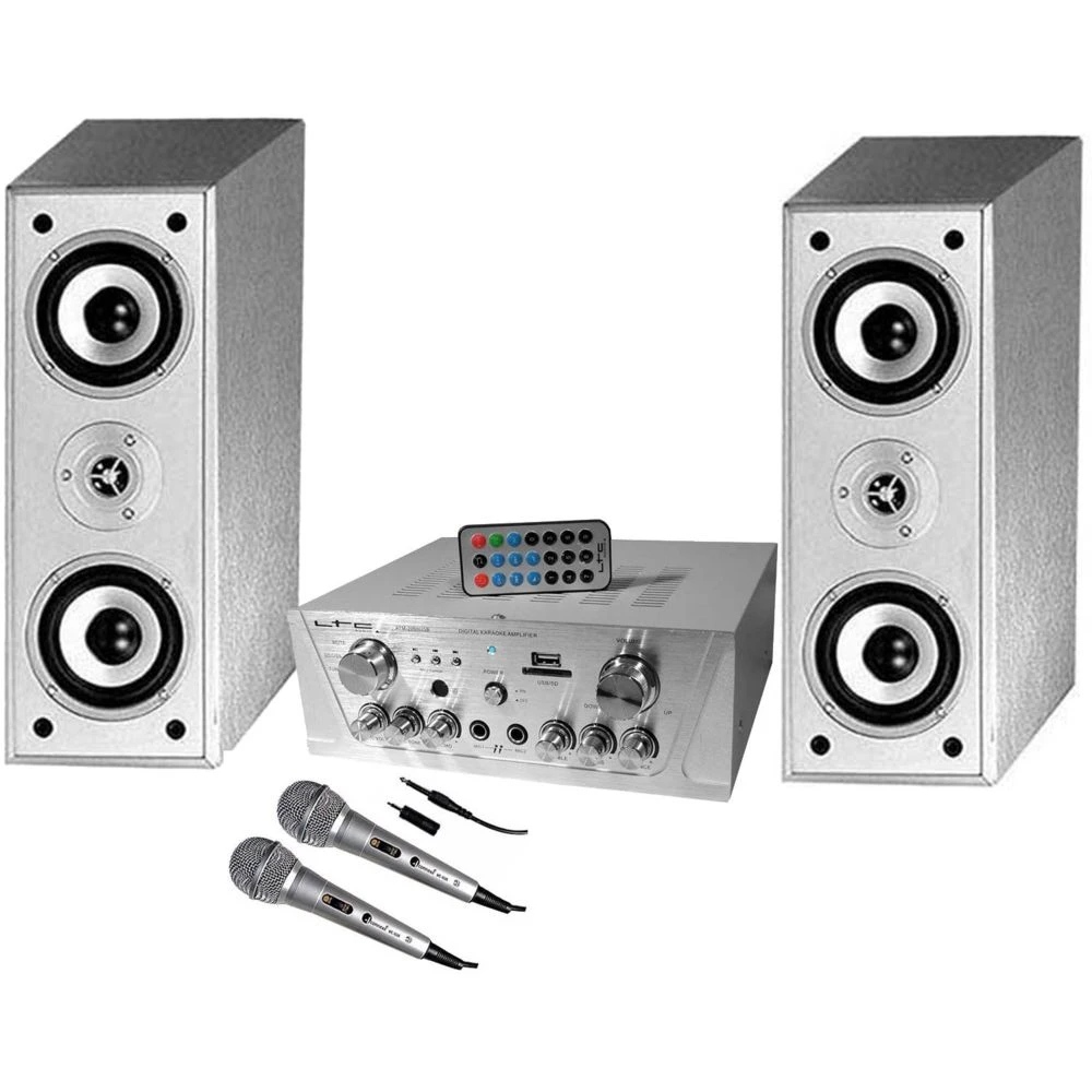 Ce pack est composĂ© d’un amplificateur LTC MP3 pour utilisation en KaraokĂ© ou petites sonorisations Ă la maison ou encore en Hifi. Ses deux entrĂ©es micros avec Ă©cho, ses lecteurs de clĂ© USB et de SD CARD et ses 3 entrĂ©es auxiliaires permettent de nombreuses combinaisons. Une Paire d’enceintes HYUNDAI Silver qui peuvent ĂȘtre utilisĂ©es en position horizontale ou verticale et d’un lot de 2 micros dynamiques unidirectionnels 4CONNEXX pour une utilisation en Sono DJ, karaokĂ©s, chant ou confĂ©rences. KaraokĂ© top qualitĂ© pour vos soirĂ©es. CĂąblage offert.CARACTĂRISTIQUES TECHNIQUES : HYUNDAI HC810-SL Puissance Max : 2 x 50 W Puissance RMS : 2 x 25 W 2 voies – Type clos Boomer : 100 mm MĂ©dium / Tweeter : 25 mm Ă dĂŽme ImpĂ©dance : 4 / 8 ohmsConnexion par bornier Ă vis Façade amovible Utilisables en position horizontale ou verticale Dimensions : L 45 x H 14,5 x P 14 cm Poids : 5,3 Kg la paire LTC ATM-2000USB Puissance Max : 2 x 50 W Puissance RMS : 2 x 30 W Bande passante : 20 Ă 20000 Hz ImpĂ©dance : 8 ohmsSensibilitĂ© : 76 dB Lecteur de clĂ© USB et de SD Card SĂ©lecteur mute, SD/USB, tuner, DVD TĂ©lĂ©commande Ă infrarouge ContrĂŽle MP3 : lecteur/arrĂȘt, recherche avant et arriĂšre EntrĂ©es : 2 micros par Jack 6,35 mm et DVD/VCD, tuner et line par RCA Sortie : 2 haut-parleurs par borniers Ă vis ou fiches bananes Dimensions : L 25 x H 9 x P 20,5 cm Poids : 2,9 Kg 4CONNEXX MC-1005 2 Micros dynamiques unidirectionnels ImpĂ©dance : 600 ohms Interrupteur marche/arrĂȘt CĂąble 2,6 mĂštres avec fiche Jack 6,35 mm et adaptateur Jack 3,5 mm