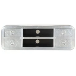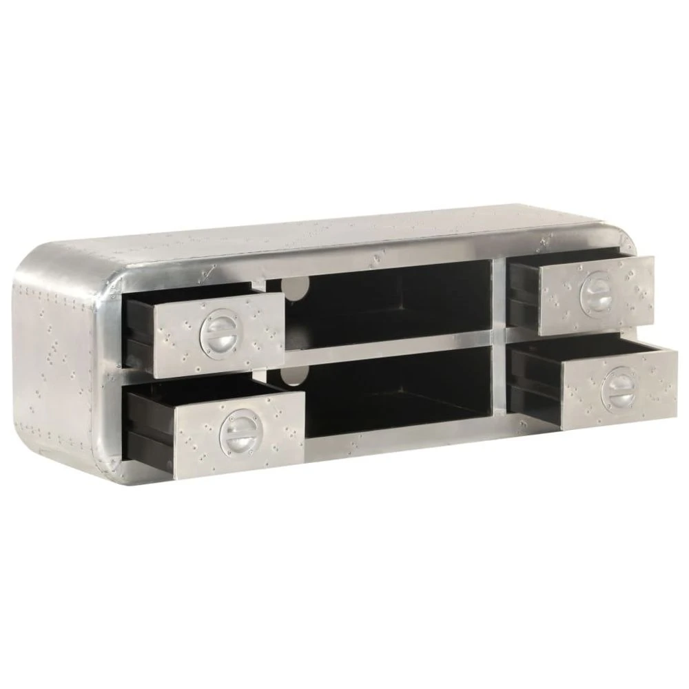 Ce meuble TV Aviator au style antique deviendra le point central de votre salon ou de votre salle de jeux. Le meuble TV au style aĂ©ronautique est en bois de manguier massif et sa surface est recouverte d’un patchwork de panneaux en aluminium poli, accentuĂ© par des vis en acier saillantes, ce qui le rend extrĂȘmement durable. Les bords arrondis et les poignĂ©es de tiroir rĂ©tro confĂšrent au meuble TV aviator un aspect unique. Les 4 tiroirs et les 2 grands compartiments vous offrent suffisamment d’espace pour ranger votre lecteur DVD, votre console de jeux, votre appareil de streaming et vos supports multimĂ©dia. Vous pouvez mĂȘme garder les cĂąbles hors de vue grĂące aux 2 sorties de cĂąbles. Remarque : le motif des rivets peut varier d’une piĂšce Ă l’autre, ce qui rend chacune de nos armoires TV unique. La livraison est alĂ©atoire.