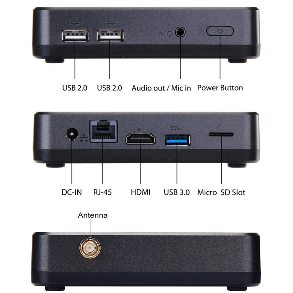 De plus, ce Mini PC Windows 10 possĂšde Ă©galement un port Ethernet RJ45 qui vous permettra de le connecter Ă votre box opĂ©rateur internet en filaire et ainsi gagner en rapiditĂ© de connexion. Si votre box internet ne se trouve pas Ă proximitĂ© du mini pc, pas de panique, ce dernier dispose d’une connexion WiFi grĂące Ă une antenne amovible afin de profiter d’un accĂšs internet sans fil. Egalement, cette box dispose d’une connexion Bluetooth qui vous permettra de facilement connecter une enceinte sans fil, un casque Bluetooth ou encore des pĂ©riphĂ©riques tels qu’une souris ou un clavier sans fil.
